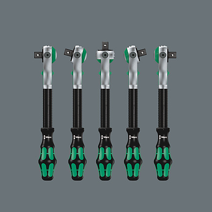 - Zyklop ratchet with 3/8″ drive. The fine toothing with 72 teeth allows for a low return angle of 5°. The ratchet head swivels freely and can be locked in any position using the slide switch on both sides. Unproblematic working with plenty of hand space even in very narrow or difficult-to-reach installation situations. The pre-defined positions at 0°, 15° and 90° to the left and right guarantee safe working without the ratchet head slipping. In the 0° position, the ratchet with adapter and bit can be used like a conventional screwdriver. The flywheel design helps accelerate the screwdriving process. The rotationally symmetrical design of the Kraftform handle and the fast-rotating sleeve support rapid turning. Thanks to the shape of the Kraftform handle being perfectly adapted to the hand, hand injuries such as blisters and calluses are avoided. The hard materials used for the handle guarantee quick hand switching without the risk of the skin “sticking” to the handle. The softer, “non-slip” zones offer transmission of high forces without loss. For 3/8″ square head socket wrench inserts as well as 3/8″ connectors with square head drive, with ball lock.