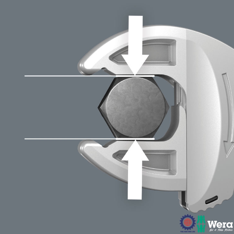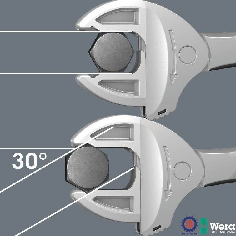 Cờ lê hai đầu tự điều chỉnh: Góc xoay trả lại (return angle) chỉ 30° nhờ thiết kế lăng trụ chữ nhật ở các góc trong hàm kẹp, giúp làm việc dễ dàng trong không gian hẹp.